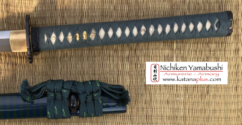 Le ito qui recouvre la tsuka (manche) est en soie verte tamisée et le saya laqué à rayures vertes complètent la tsuba patinée avec des accents dorés contribue à l'élégance de l'ensemble. Le thème du katana est  un rapace traquant sa prochaine proie.